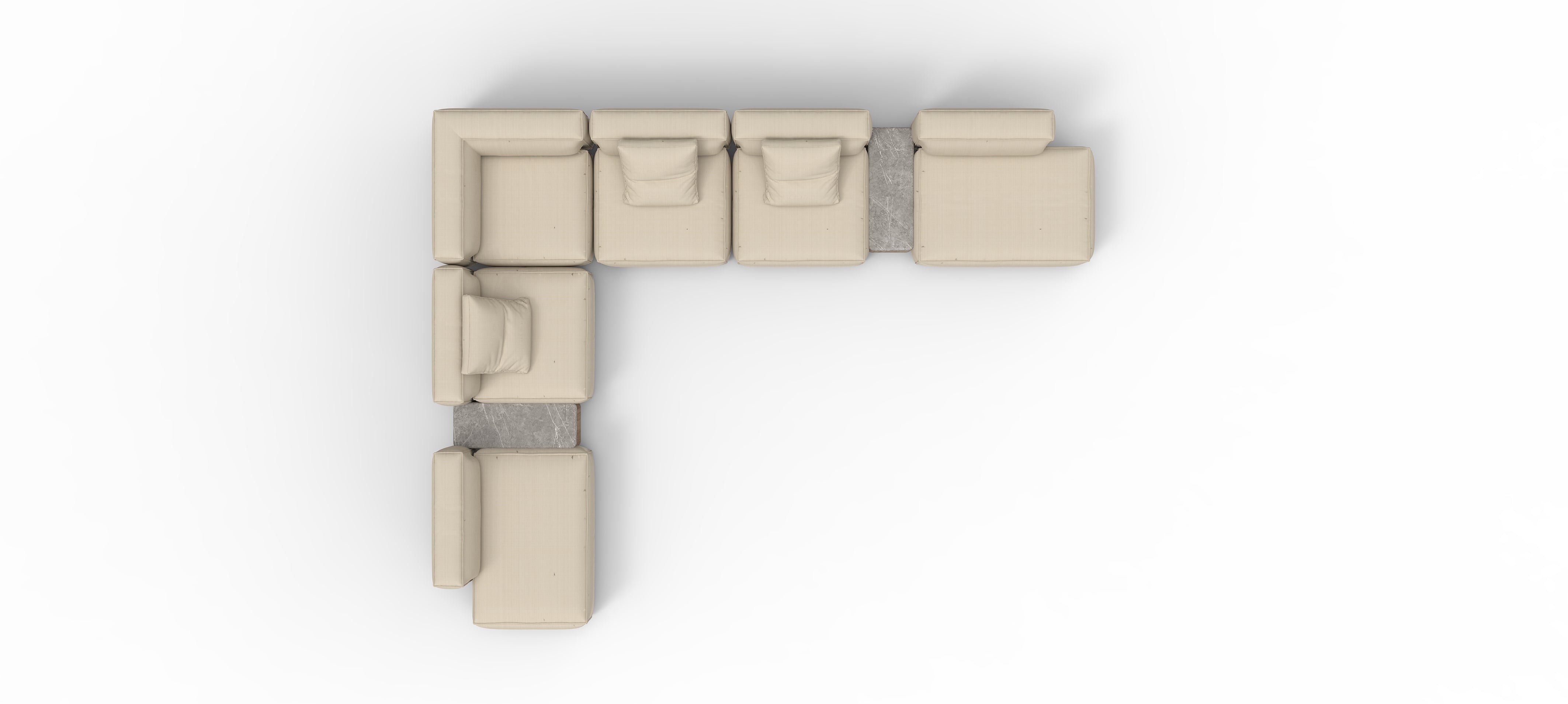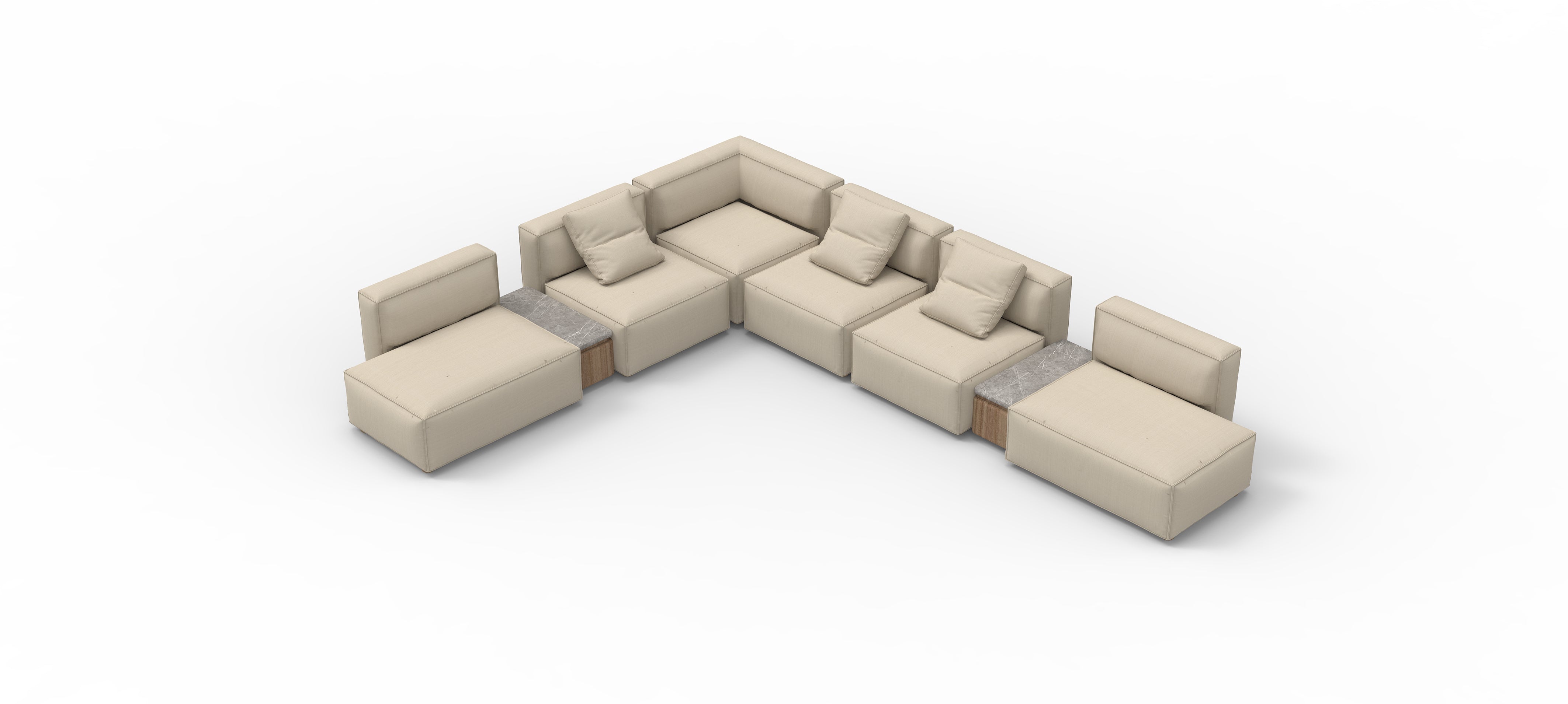 El diseño se acentúa con pequeñas mesas de apoyo fabricadas en madera, que dividen el sofá con ritmo visual y funcionalidad. Estas superficies ofrecen un lugar práctico para colocar bebidas, libros o piezas decorativas, añadiendo dinamismo y orden al conjunto. La cubierta de estas mesas está realizada en mármol 100% natural, aportando un contraste táctil y visual de carácter escultórico.