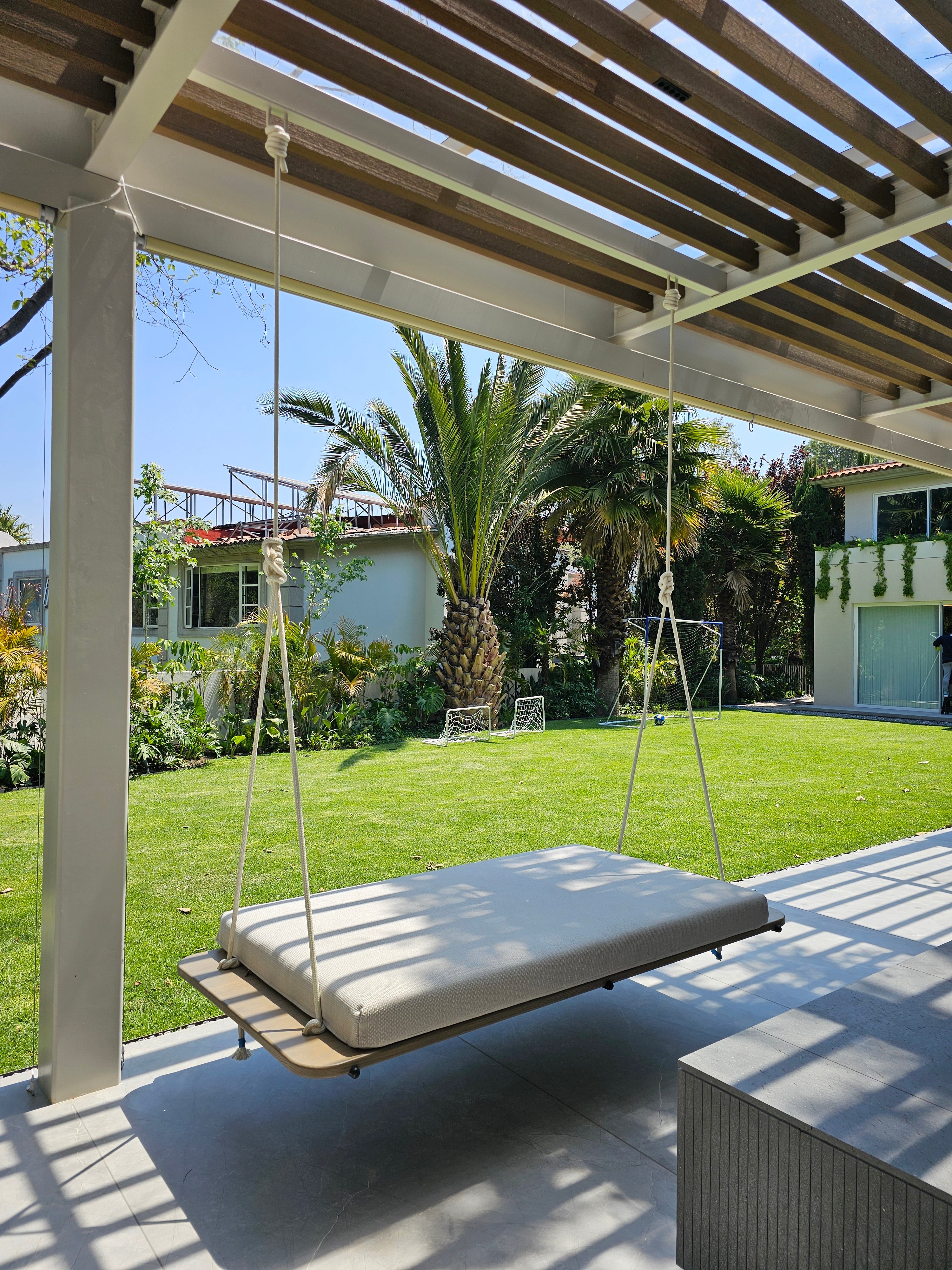 Este columpio de descanso es una pieza escultórica y funcional, diseñada para convertirse en el centro de atención en terrazas, jardines o patios interiores. Su diseño, elegante y sereno, integra una base flotante elaborada en madera maciza de tala sustentable, que se extiende delicadamente más allá del cojín central, generando una silueta sofisticada y envolvente.