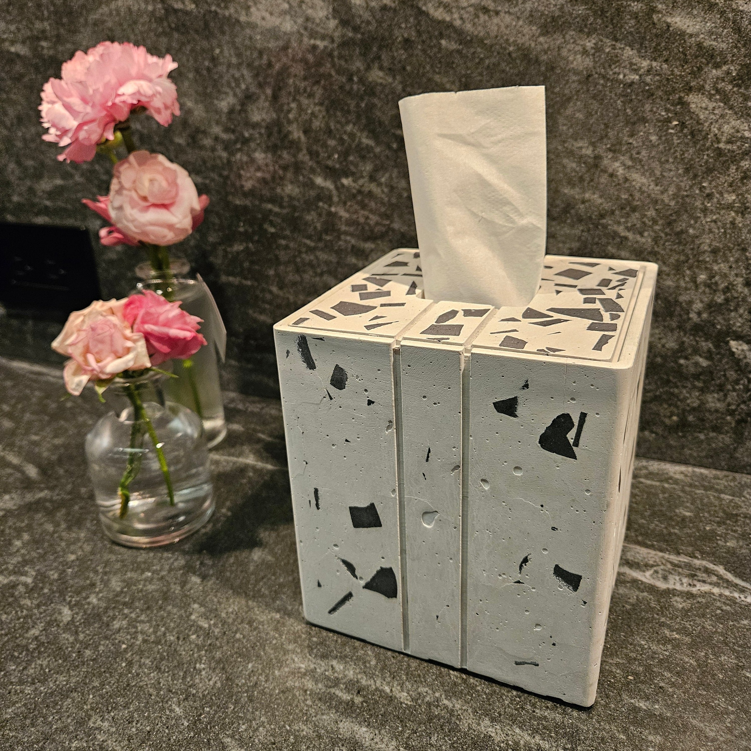 ¡Simplifica tu vida con nuestro elegante recipiente para Kleenex fabricado en terrazzo! Olvídate de los inconvenientes de tener que voltear el recipiente para colocar la caja de Kleenex o meter los dedos buscando el pañuelo que no subio, gracias a su diseño innovador con tapa superior. Con solo retirar la tapa, podrás insertar fácilmente la caja de pañuelos sin esfuerzo y disfrutar de la conveniencia de un acceso rápido y sin complicaciones.