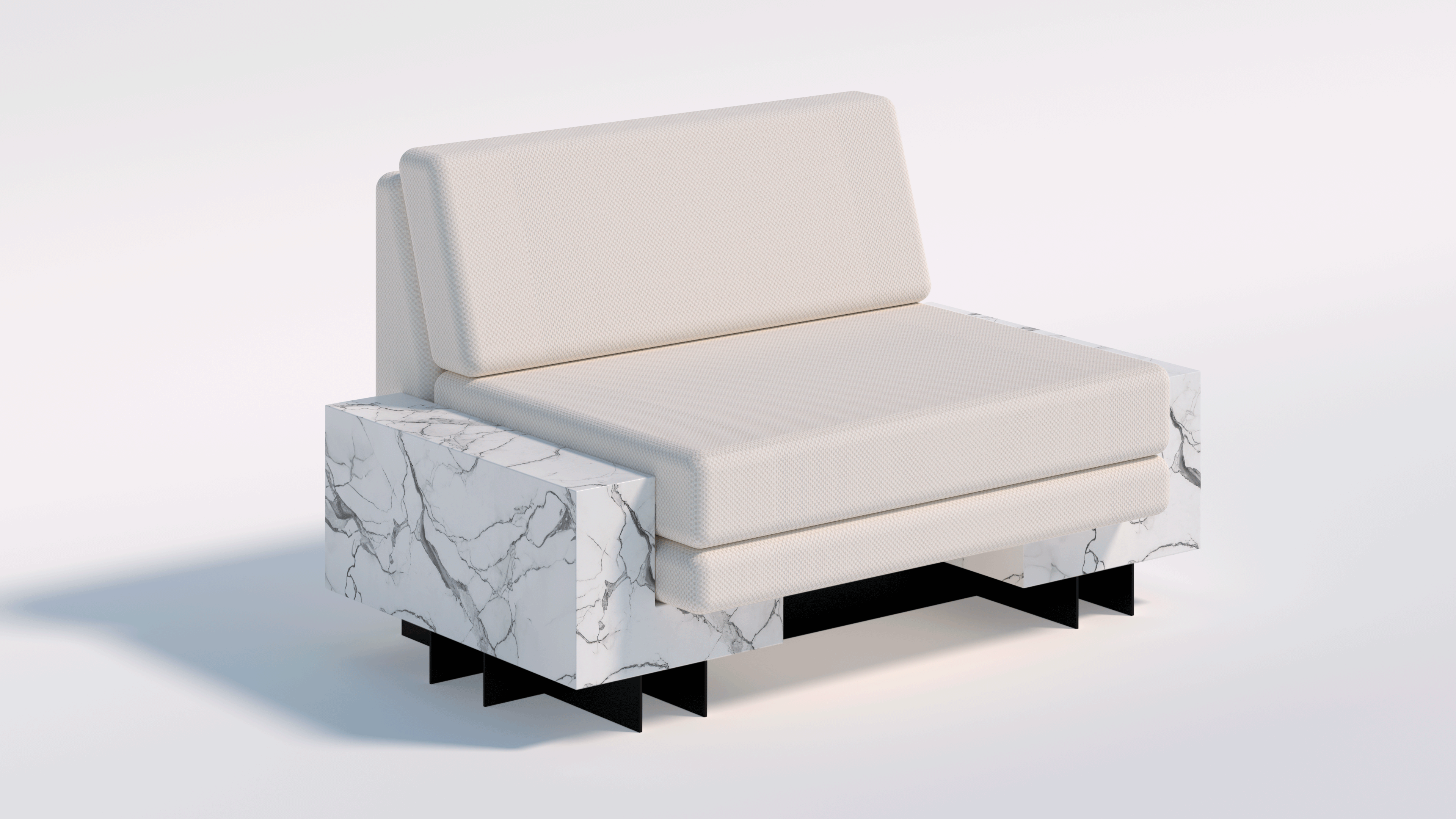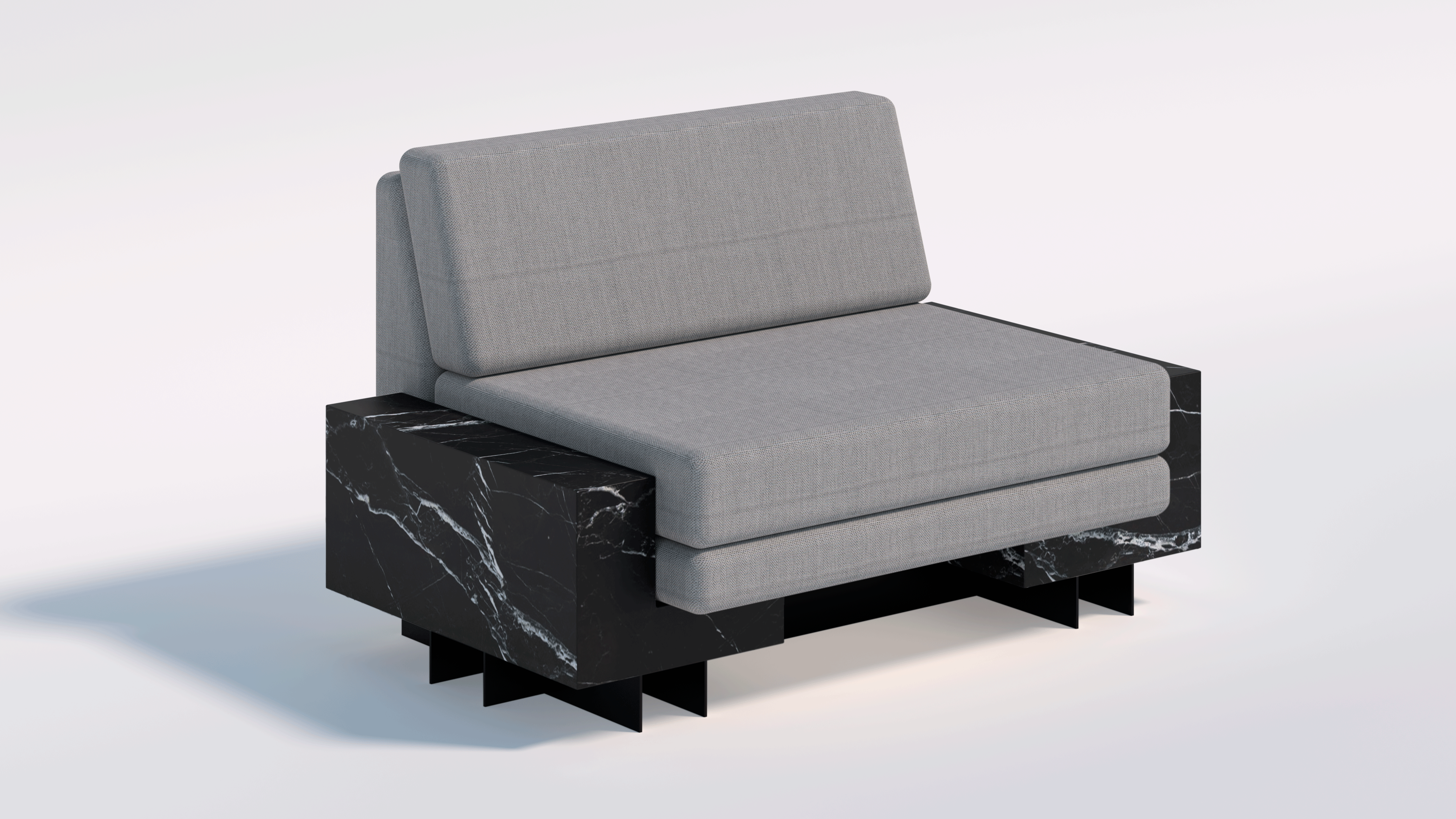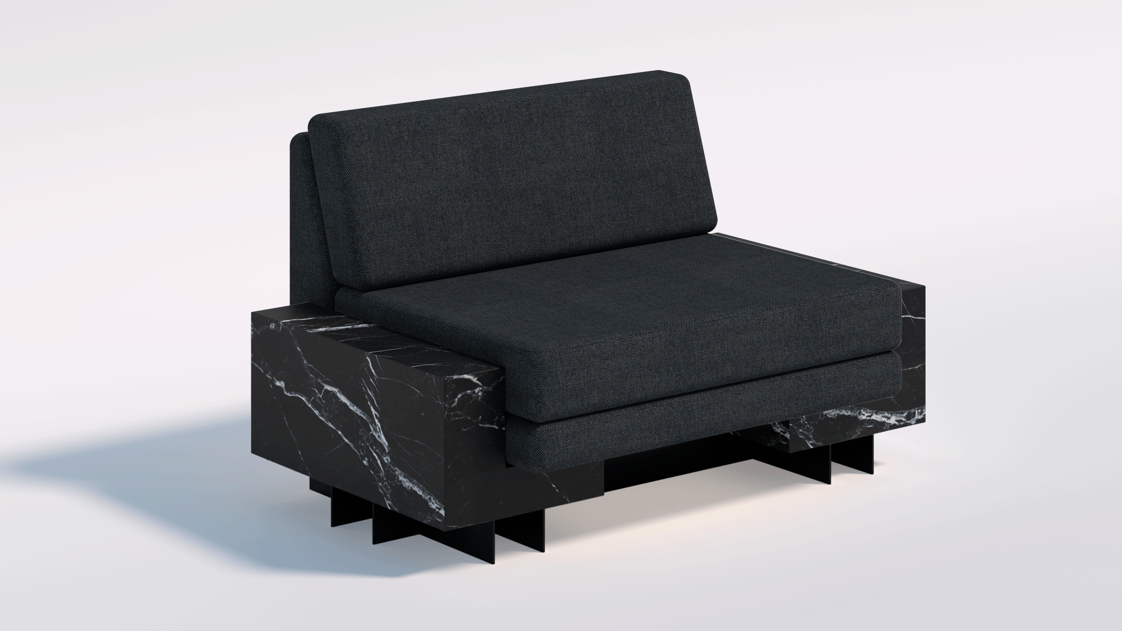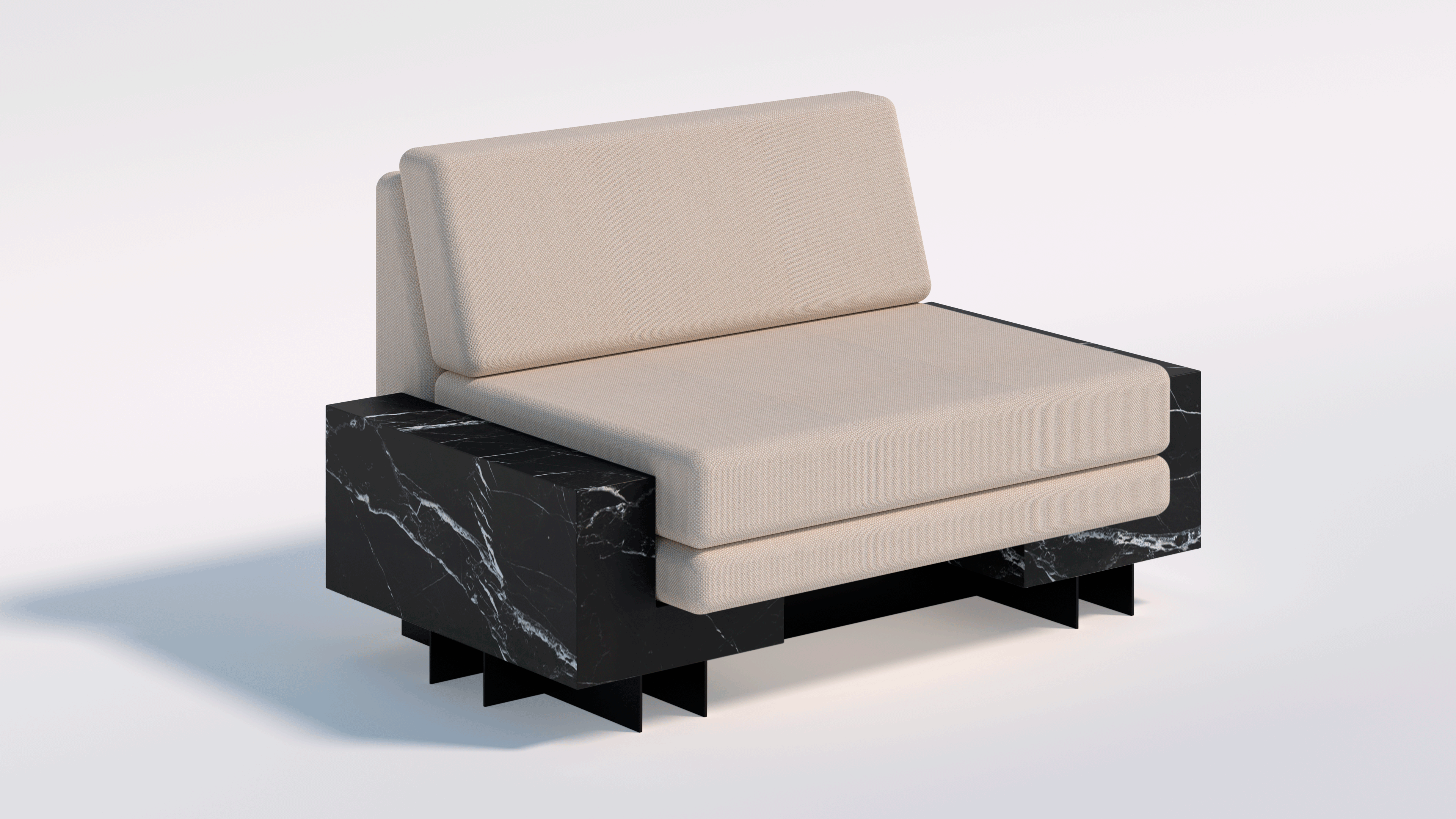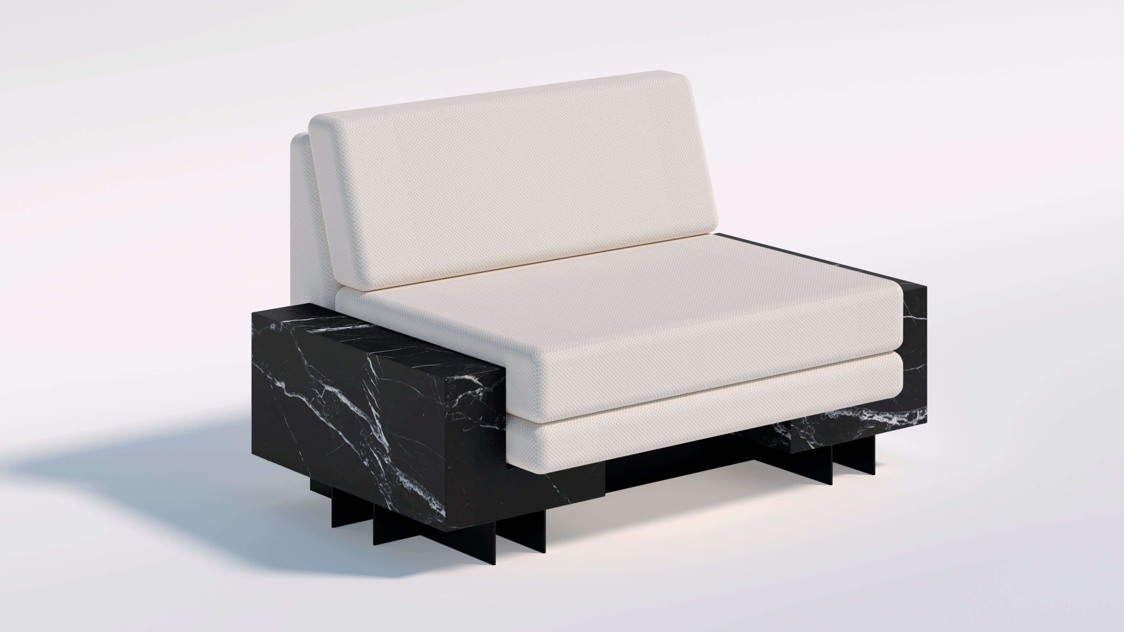 Sus laterales, esculpidos en mármol natural y labrados a mano por artesanos expertos, aportan una presencia escultórica que evoca solidez, elegancia y atemporalidad. Cada veta revela la unicidad del material, haciendo de cada pieza una obra irrepetible.