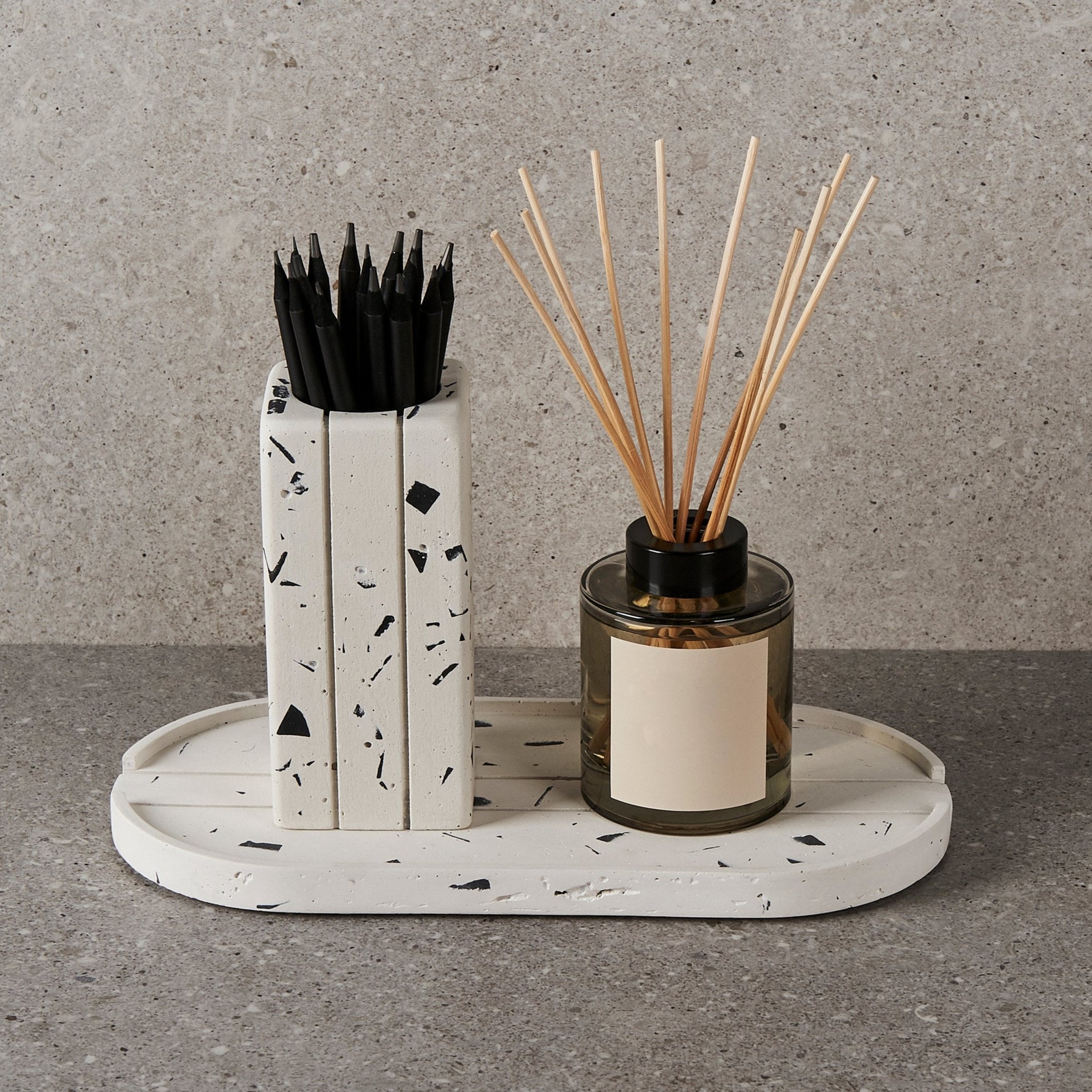 El terrazzo, agregará un toque de sofisticación a tu baño, escritorio o tocador. Su diseño resistente y duradero asegura que tus herramientas de uso diario estén siempre al alcance de la mano, mientras que su aspecto moderno y minimalista complementa cualquier decoración.