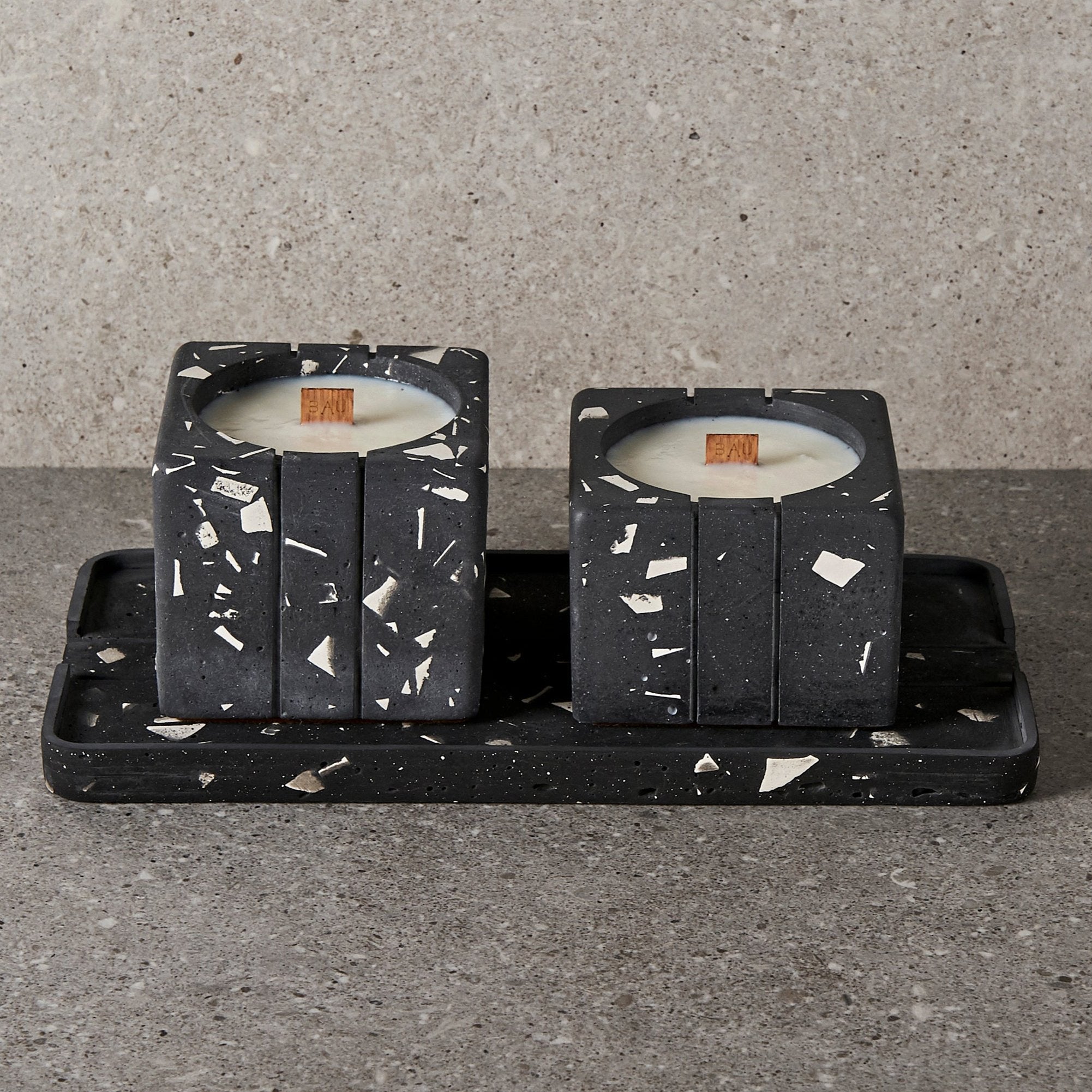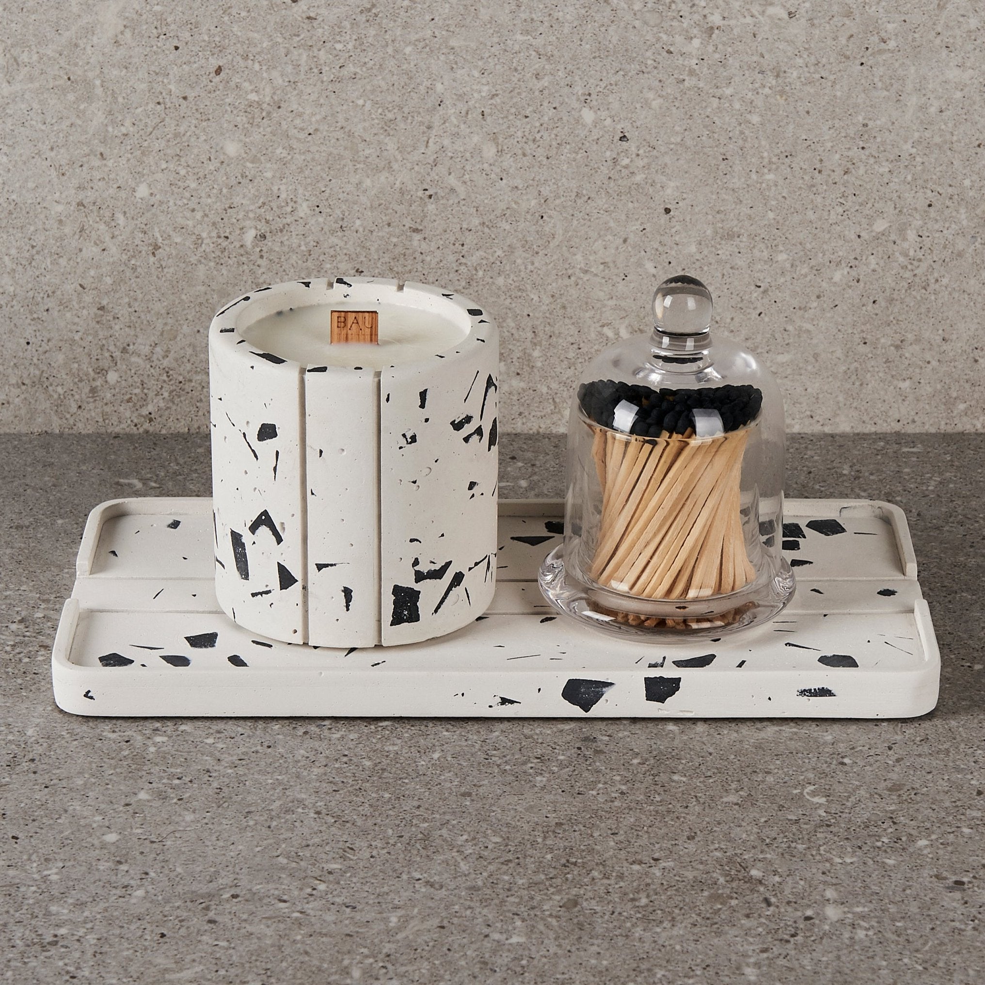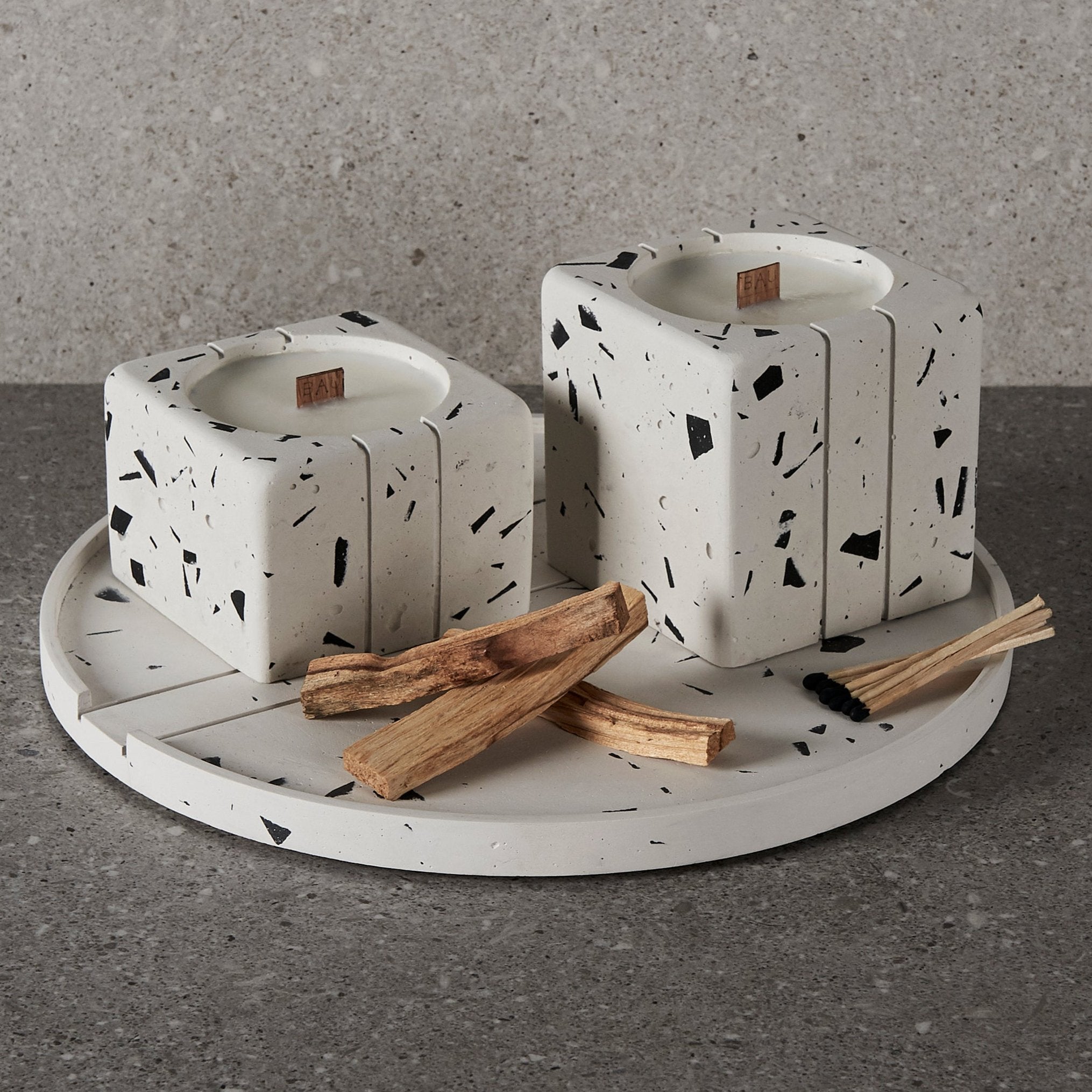 ¡Descubre nuestras velas artesanales, elaboradas con cera de soya y envases de terrazzo, ofreciendo intensos aromas en un recipiente elegante!