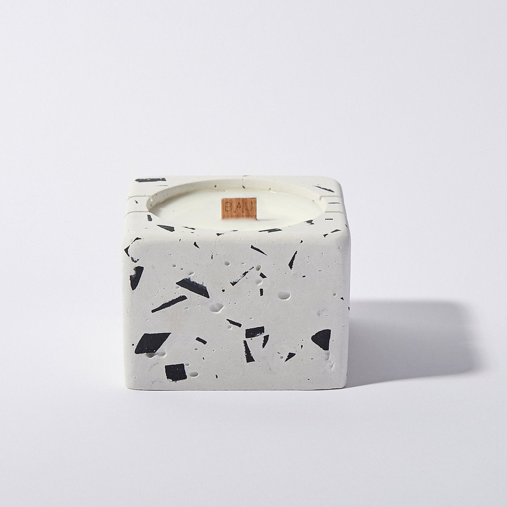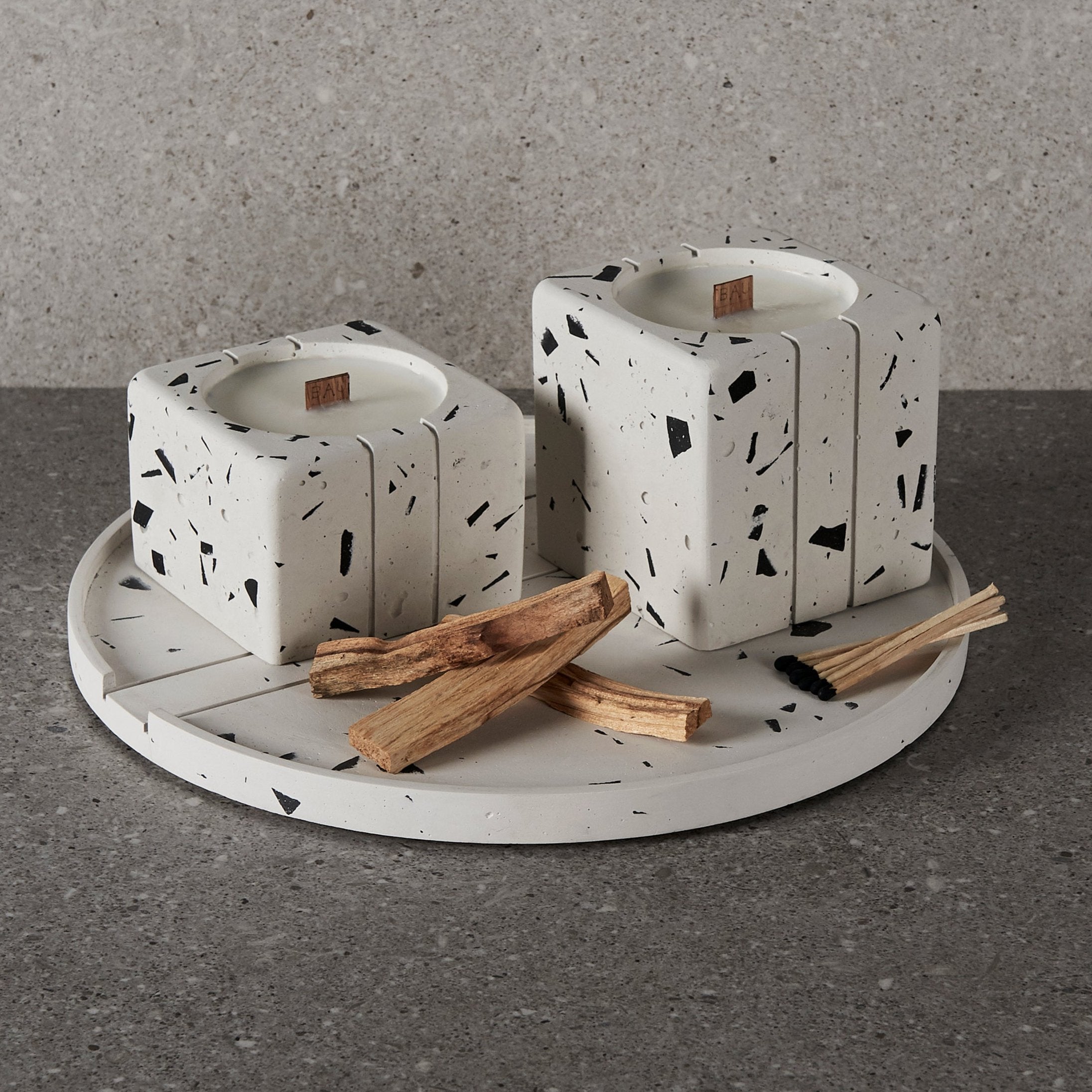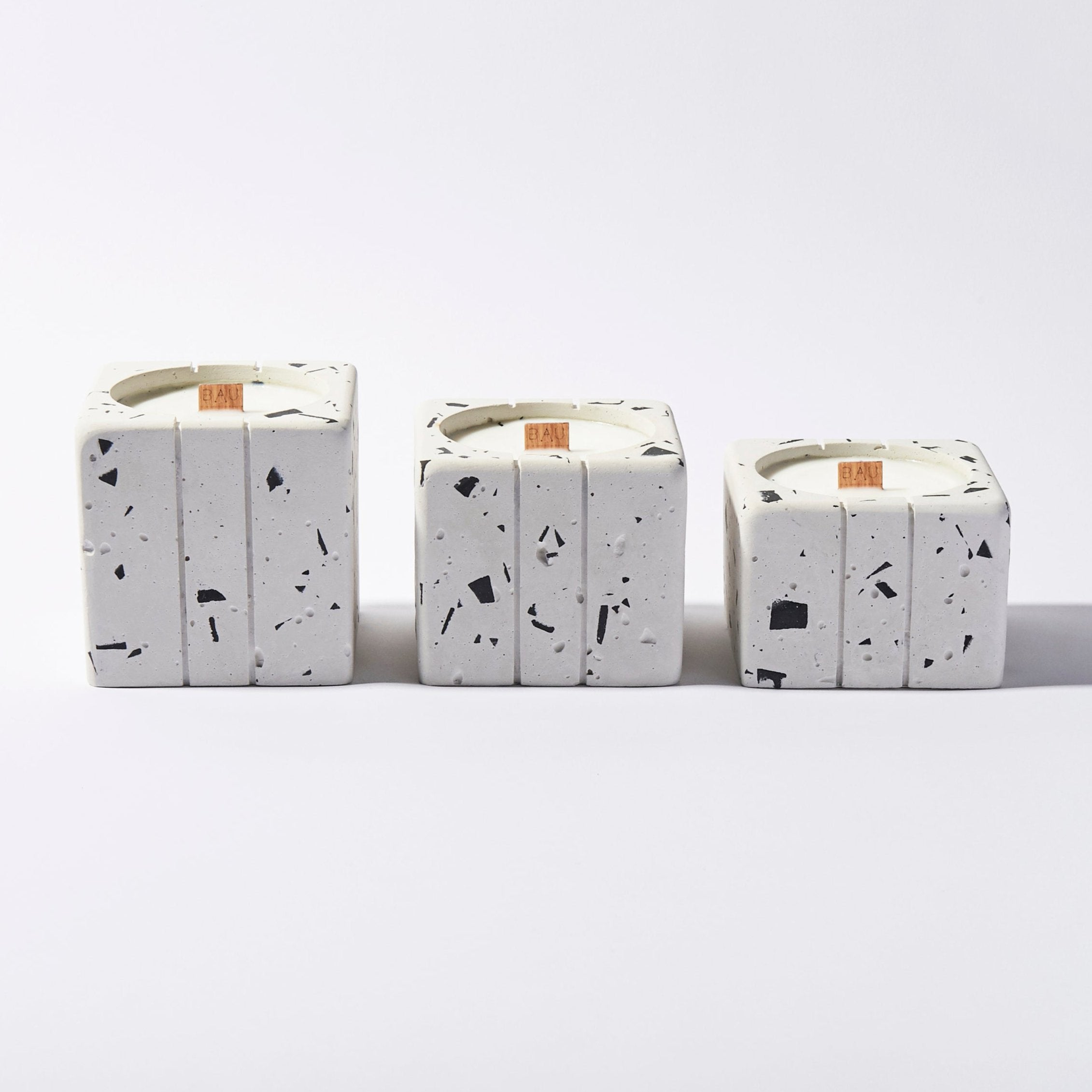 ¡Descubre nuestras velas artesanales, elaboradas con cera de soya y envases de terrazzo, ofreciendo intensos aromas en un recipiente elegante!